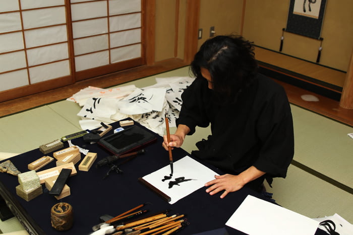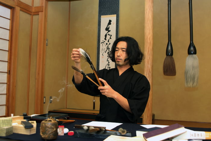 続いて筆選び。とめ・はね・はらいなど、筆の違いによって大きな差が出ます。僅かな違いで印象が変わるので、 念入りに選び、味の出方を確かめます。