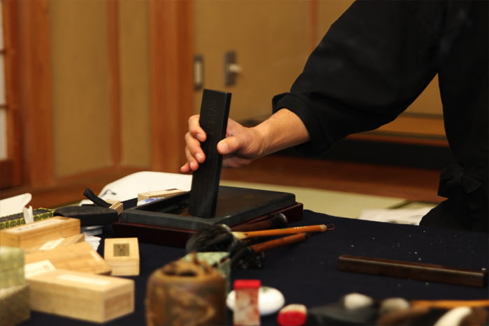 筆が決まったら、気持ちを落ち着けて墨を摩っていきます。墨汁と違い、摩った墨は香りもよく濃墨淡墨の表現出来る幅が違います。 墨色は「黒」と言いましても、さまざまな色があります。油煙の持つ紫紺系の黒や松煙の青灰色など数多くある「黒」の中から最適な色味を決定します。