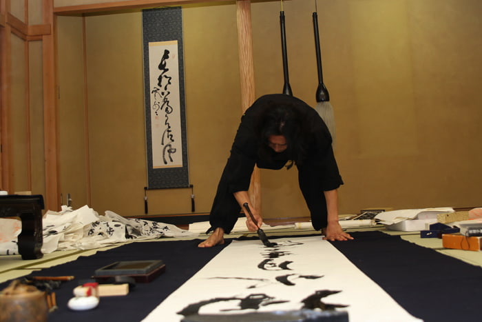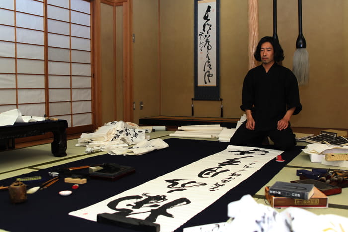 懸垂幕のように大きな作品の揮毫依頼を受けることも度々ありますが、その場合は特に全体のバランスを考えながら書き進めていきます。 ちなみに、パフォーマンス依頼の際は、この写真の紙よりもっともっと大きな紙と筆を使い、豪快に書いていきます。